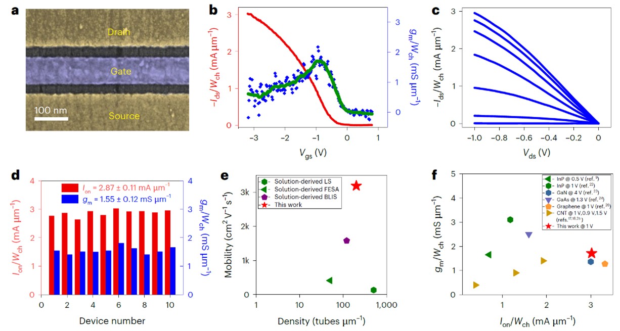 图2: A-CNT MOSFETs的结构、直流和射频性能