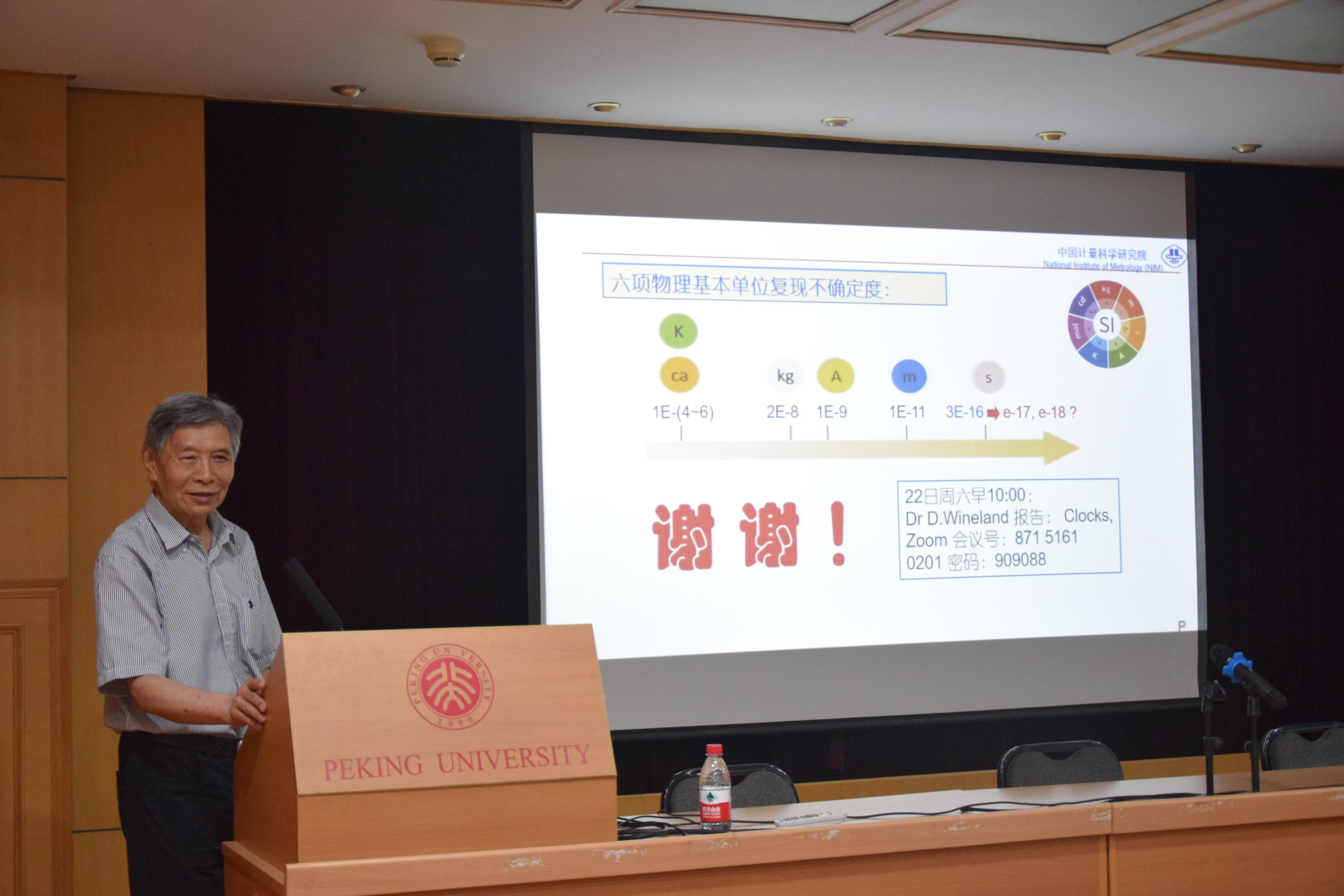 理科二号楼2736报告厅顺利举行。本期论坛邀请到中国工程院院士、中国计量科学研究院李天初研究员作主题为“国际基本单位常数化和中国计量院的应对研究”的学术报告。讲座由电子学系量子电子学研究所所长郭弘教授主持,全系50余名师生到场聆听了报告。