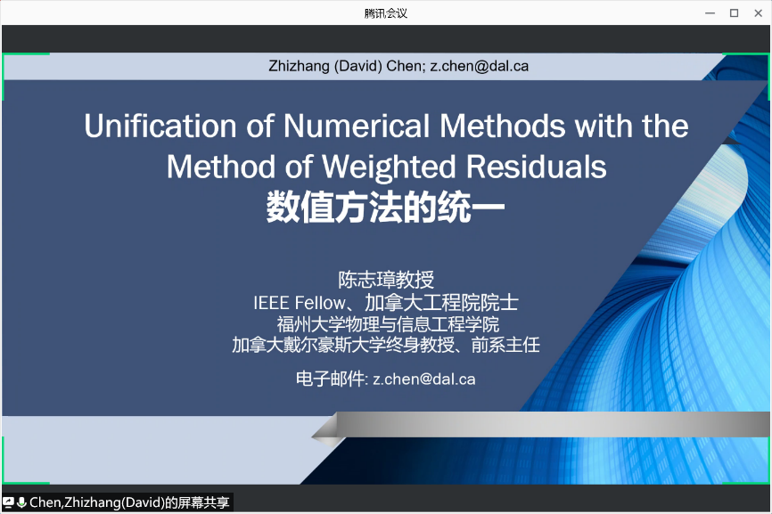 前沿学术论坛第二十三期通过网络顺利举行。本期论坛邀请到IEEE Fellow、加拿大工程院院士、福州大学物理与信息工程学院特聘教授、加拿大戴尔豪斯大学终身教授陈志璋做主题为“Unification of Numerical Methods with the Method of Weighted Residuals (基于加权余量法的数值方法的统一) ”和“中长距离无线能量传输-电磁技术与应用”的学术报告。讲座由有爱爱