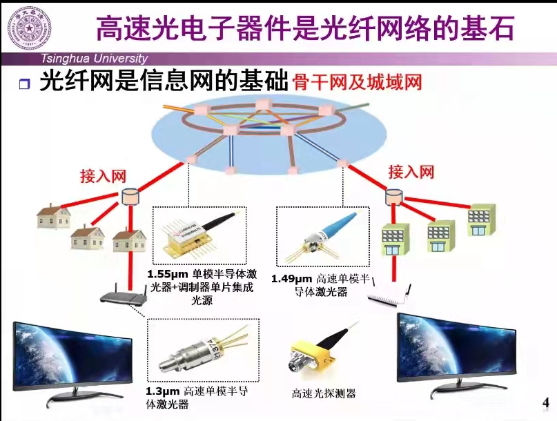 针对光波超大带宽的技术特质及其在高速光电子器件方面的应用,罗毅院士从光波超大带宽特性、光纤通信在现代网络通信中的重要性为引导,介绍了目前光纤通信速率/容量需求持续快速增长的现状,同时针对高速激光器单色性差是制约光通信速率提升的主要瓶颈的问题,通过控制等离子密度、平衡物理和化学作用机制,形成GaAs基、InP基、GaN基异质材料原子级平整干法刻蚀技术,研制增益反馈激光器,通过DFB激光器与电吸收(EA)调制器集成光源实现更高的调制速率和更长的传输距离,我国首次研制成功的40Gb/s集成光源模块为国际上已报道的40Gb/s集成光源的最佳结果之一。