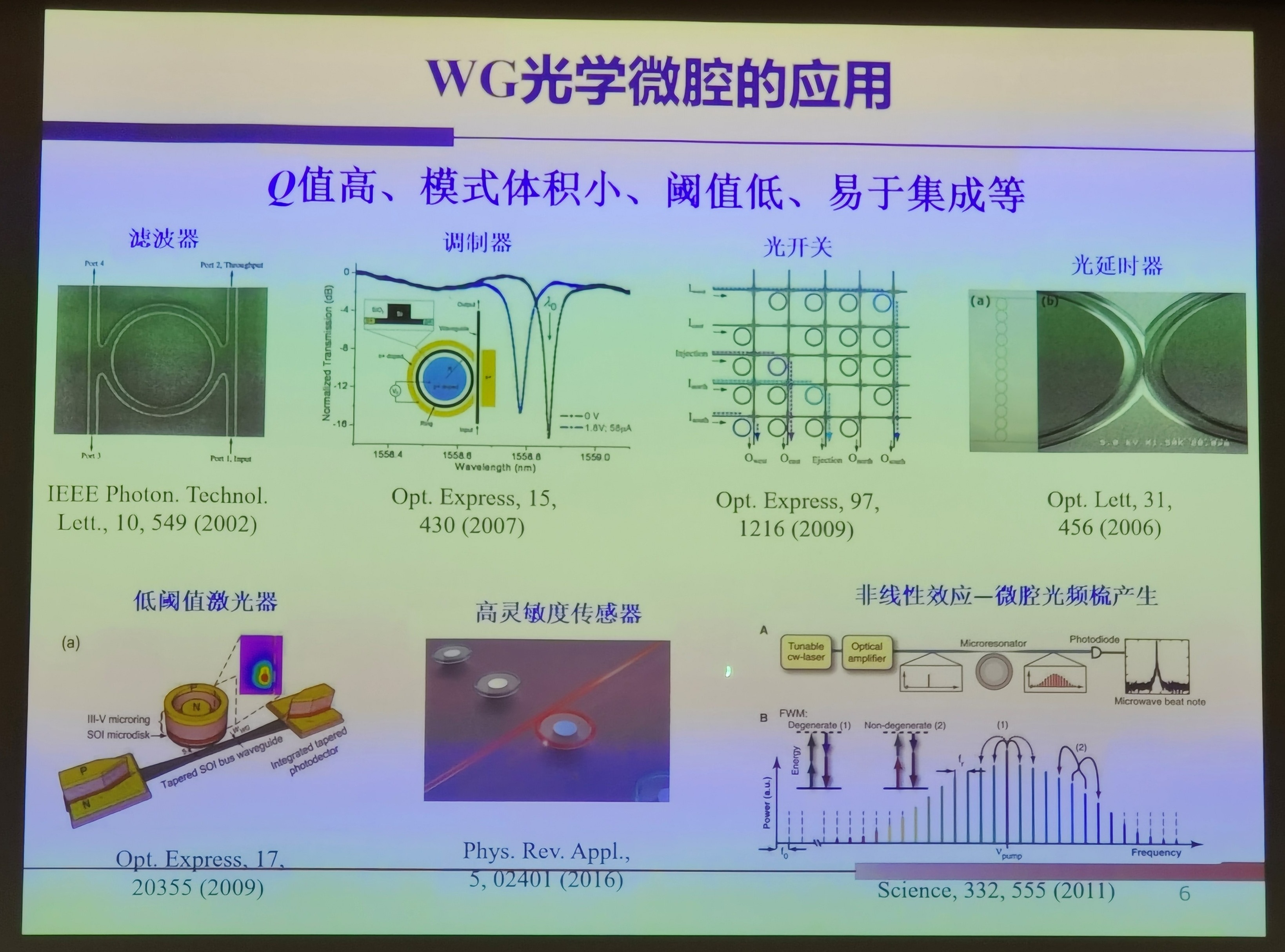 黄永箴研究员从回音壁的历史起源讲起,回音壁模式是1910由Lord Raleigh在论文中提出,研究了伦敦圣保罗教堂的回音壁问题,其原理是声波可以不断地在弯曲光滑的墙面反射而损耗很小,所以声音可以沿着墙壁传播很远的距离。光在尺寸大于波长水滴的散射与水中的限制回音壁模式相关,在闭合腔体的边界内,光可以一直被囚禁在腔体内部保持稳定的行波传输模式。将回音壁模式拓展到微腔领域,即为模式光线在界面的内全反射模式。随着硅基光电子学的迅猛发展,硅基波导光学微腔具有Q值高、模式体积小、阈值低、易于集成等特点。微盘以及变形微腔激光器由于具有旋转对称性,不利于实现定向耦合输出。为了解决这个问题,可以通过采用变形腔打破对称性,使得光线在部分边界不满足全反射条件,从而实现输出。传统的倏逝波耦合输出的微盘激光器,其耦合输出对间距非常敏感。而对于直连波导的回音壁模式微腔激光器,可以采用三角形、正方形、多边形及圆形波导的输出,不需要采用倏逝波耦合。