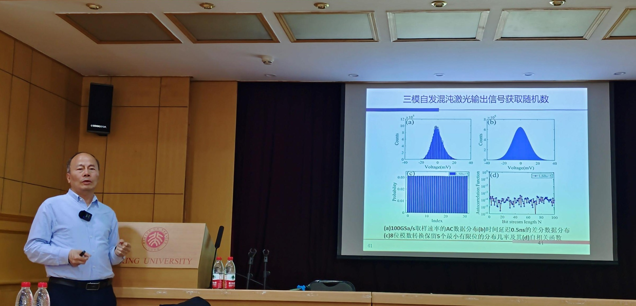 在提问环节,聆听报告的师生们与黄永箴研究员进行了充分的交流。黄永箴研究员对于当前混沌激光光源的几种方案发表了自己的观点,对于混沌光源的关键性能参数进行了比较。