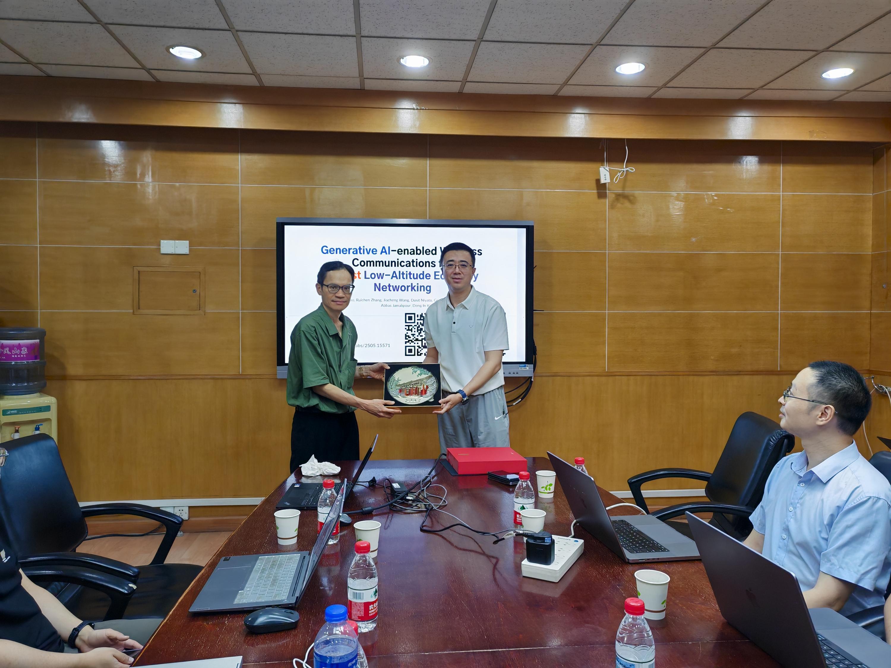 党委副书记程翔教授主持,吸引了30余名校内外师生参会。程翔教授在致辞中对Niyato教授的到来表示热烈欢迎,并高度评价了他在学术研究和工程应用领域的卓越贡献。程翔教授特别指出,Niyato教授的报告不仅聚焦了当前最热门的大模型、强化学习等交叉前沿领域,更将这些技术与低空经济、未来通信等国家重大战略需求紧密结合,为我校师生提供了宝贵的学习机会和深入思考。程翔教授衷心祝愿本次讲座能够进一步促进学术交流与合作,并向Niyato教授颁发了讲座纪念品,以表达感谢。
